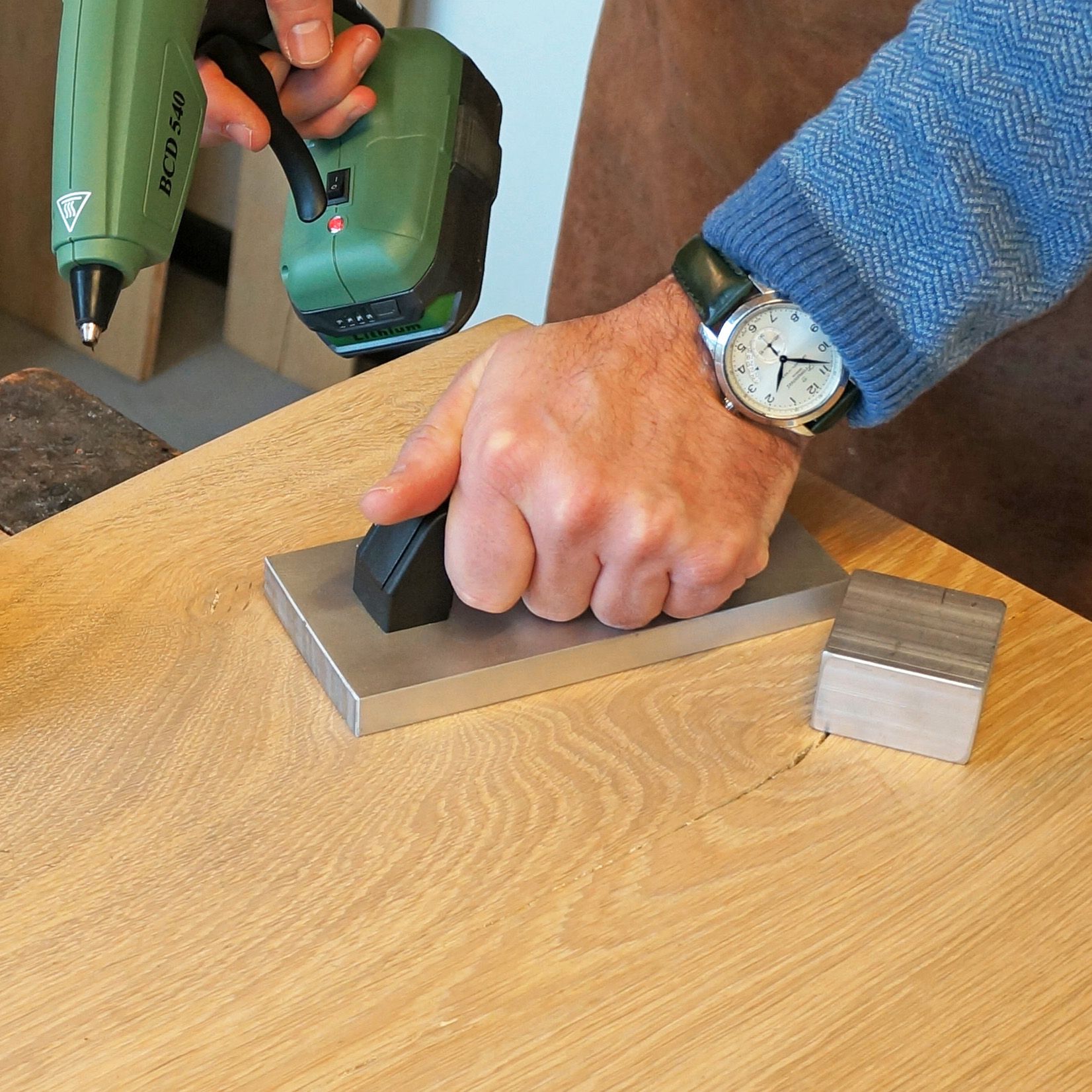 Das Wood Repair Kühleisen 80 × 180 mm ist ein essentielles Werkzeug bei der Verarbeitung von Astfüllern. Die breite Aluminiumplatte sorgt für gleichmäßiges Abkühlen von großflächigen Reparaturen – zuverlässig und präzise.