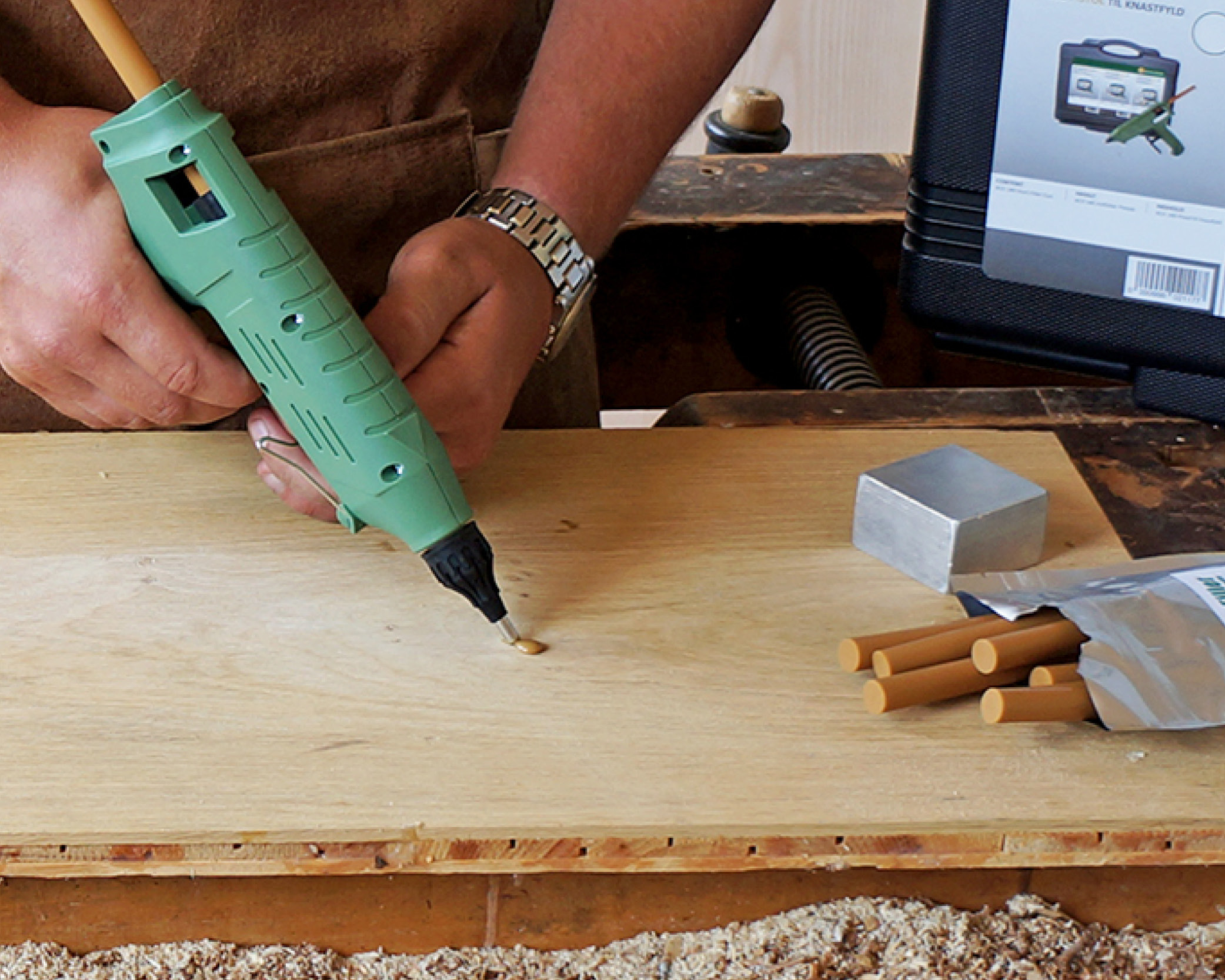 FeaturesComplete and professional wood repair kit for knot filler application. The best wood repair kit for professional woodworkers.The professional kit is a complete case with all the necessary components to make perfect knot filler repairs.The professional kit is ideal for larger productions and industrial use for ongoing repairs in wood.Contents Bag of knot filler (9 rods, 300mm, Ø12mm) BCD 360 branch filler gun with adjustable thermostat Cooling iron with handle (180x80mm) Hand plane (steel blade and beech handle) Manual and colour card 3 mm nozzle Plastic case Colour changer Branch filler colour card